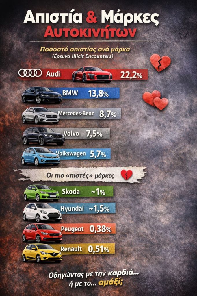 📌 Δεν υπάρχει επίσημη γενική στατιστική για απιστία ανά μάρκα αυτοκινήτου, αλλά με βάση μια μεγάλη online έρευνα: